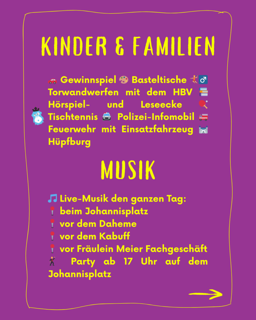 Von einem ersten Live-Auftritt von Nele bis hin zu etablierten Musiker:innen wie DJ Legeres, DJ Coins, Mitchi „Beatklops“ Nagler und der Banda Internationale – für abwechslungsreiche Klänge ist den ganzen Tag gesorgt. Ob entlang der Wagnergasse oder auf dem Johannisplatz – du wirst überall von großartigen Sounds begleitet!
